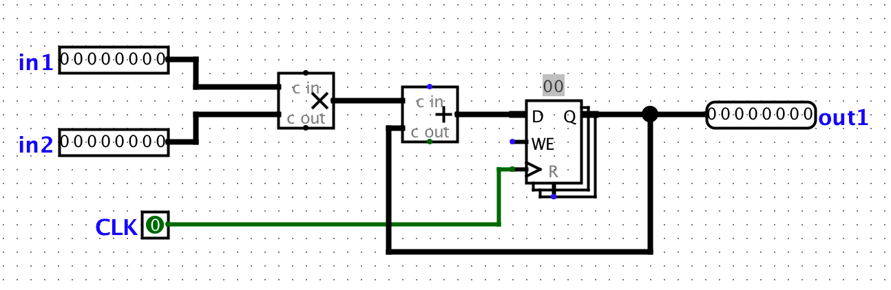 We want to improve the performance of this circuit and let it operate at a higher clock rate. In order to accomplish this, we want to have two stages in our pipeline: a multiplication stage and an addition stage, in that order.