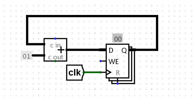 Now, tick the clock one full cycle. The circuit should be at time step 1 now (the gadget you made in step 3 should also reflect that).